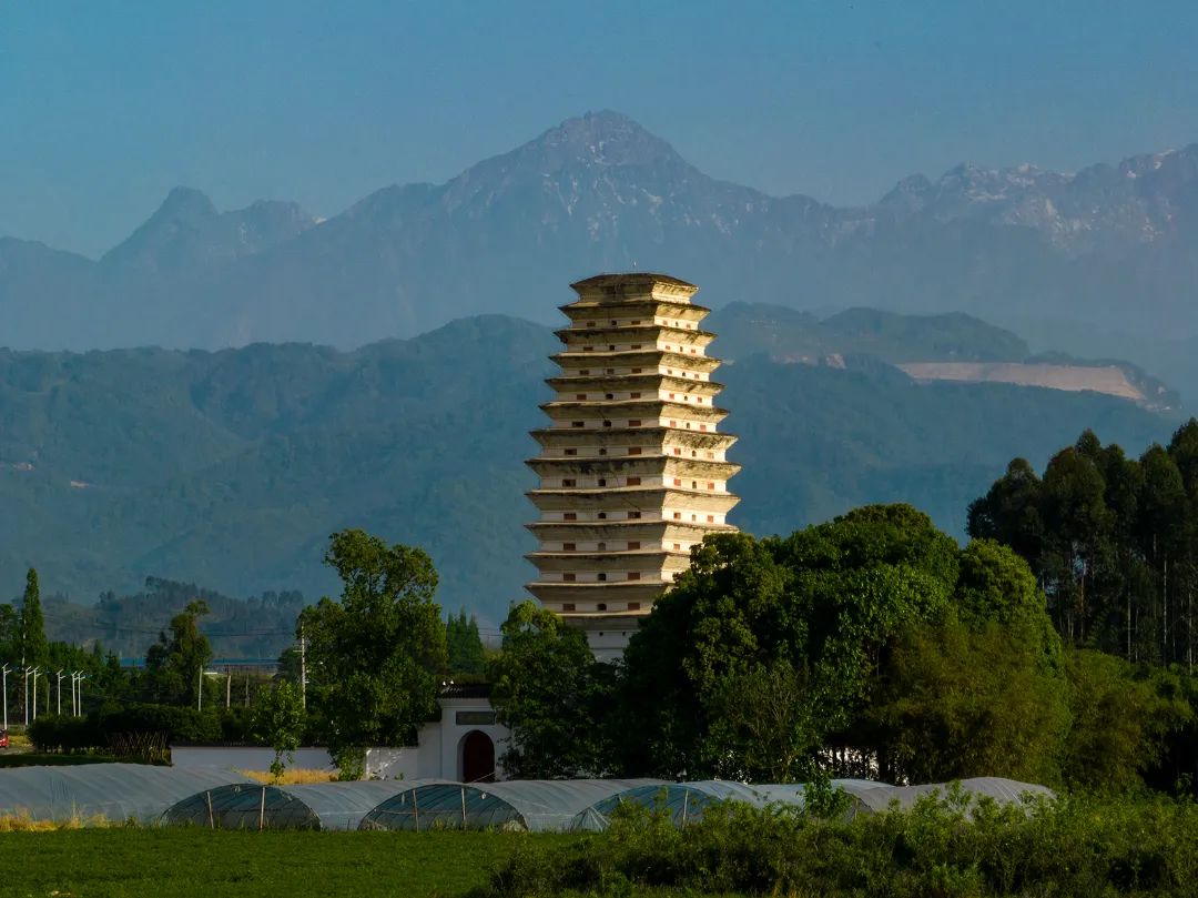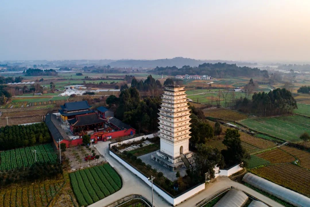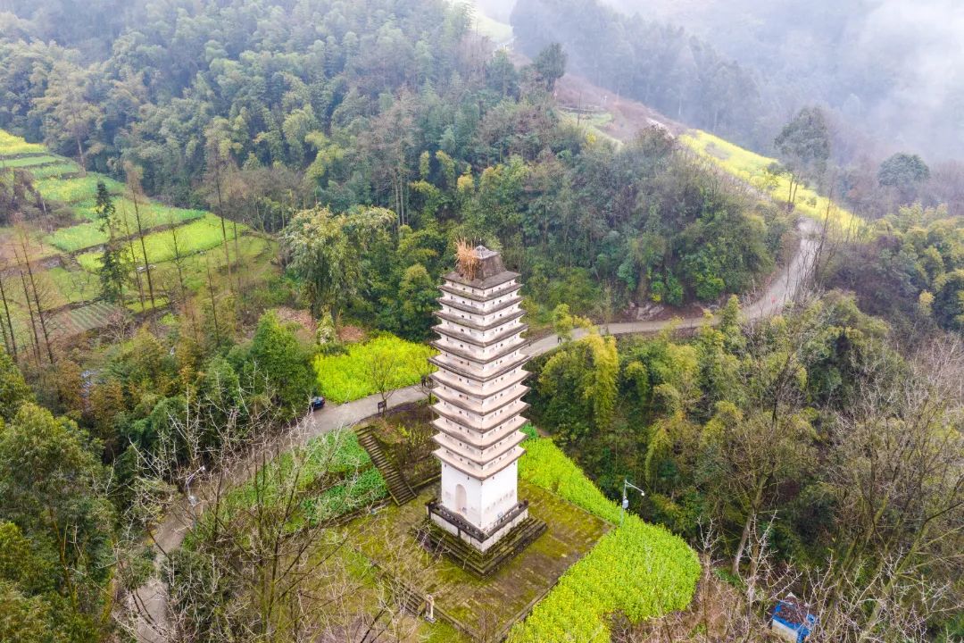 从成都出发前往彭州丹景山镇,不过一个小时车程,很多人会去景区游山赏花,却并不知道,景区之外的小山之上,就是镇国寺塔,从北宋至和元年(公元1054年)开建,距今已经900多年。